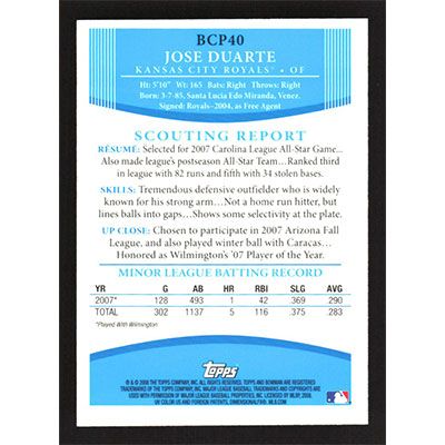 This is a 2008 Bowman Chrome Prospects Jose Duarte baseball card. The card is #BCP40 and pictures show condition.