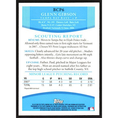 This is a 2008 Bowman Chrome Prospects Glenn Gibson baseball card. The card is #BCP6 and pictures show condition.