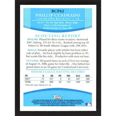This is a 2008 Bowman Chrome Prospects Phillip Cuadrado baseball card. The card is #BCP62 and pictures show condition.
