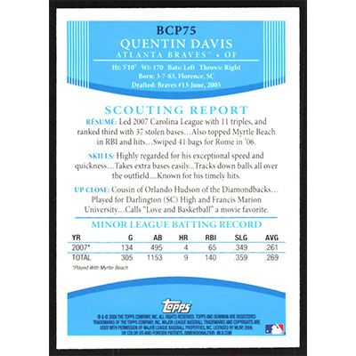 This is a 2008 Bowman Chrome Prospects Quentin Davis baseball card. The card is #BCP75 and pictures show condition.