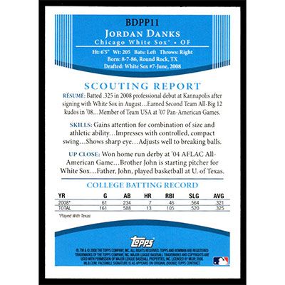 This is a 2008 Bowman Draft Prospects Jordan Danks baseball card. The card is #BDPP11 and pictures show condition.