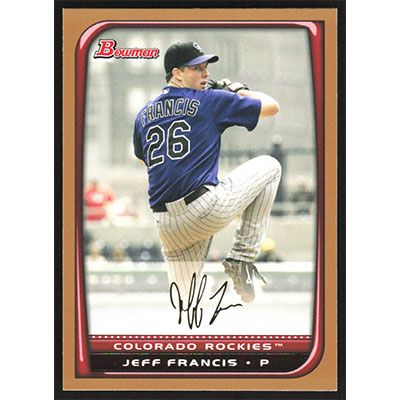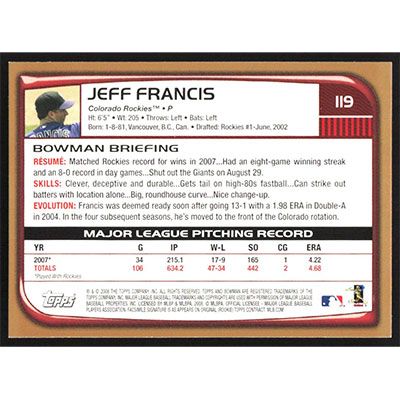 This is a 2008 Bowman Gold Jeff Francis baseball card. The card is #119 and pictures show condition.