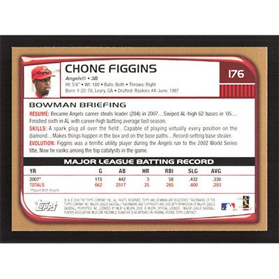 This is a 2008 Bowman Gold Chone Figgins baseball card. The card is #176 and pictures show condition.