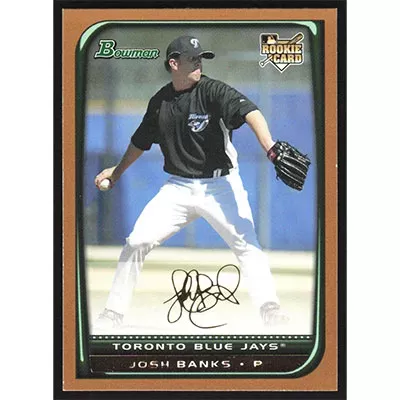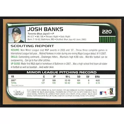 This is a 2008 Bowman Gold Josh Banks baseball card. The card is #220 and pictures show condition.