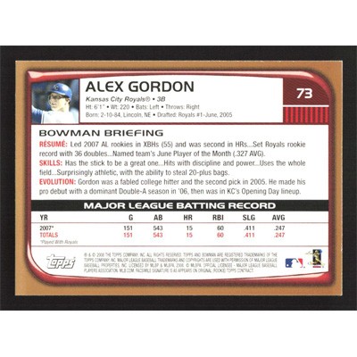 This is a 2008 Bowman Gold Alex Gordon baseball card. The card is #73 and pictures show condition.