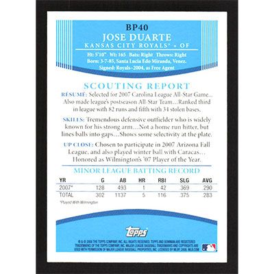 This is a 2008 Bowman Prospects Jose Duarte baseball card. The card is #BP40 and pictures show condition.