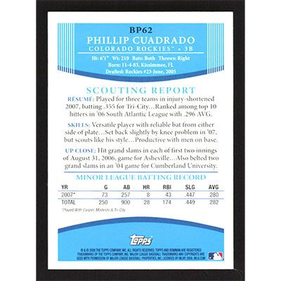 This is a 2008 Bowman Prospects Phillip Cuadrado baseball card. The card is #BP62 and pictures show condition.