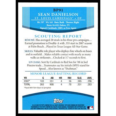 This is a 2008 Bowman Prospects Sean Danielson baseball card. The card is #BP91 and pictures show condition.