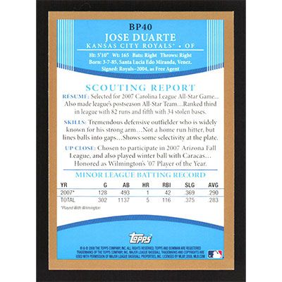 This is a 2008 Bowman Prospects Gold Jose Duarte baseball card. The card is #BP40 and pictures show condition.