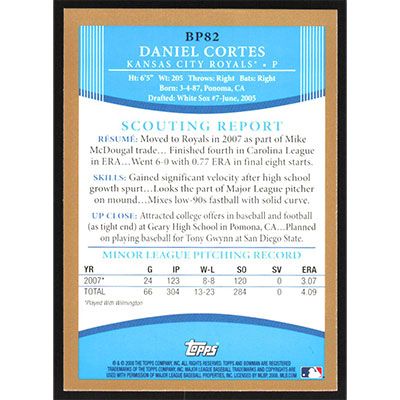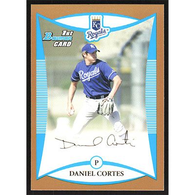 This is a 2008 Bowman Prospects Gold Daniel Cortes baseball card. The card is #BP82 and pictures show condition.