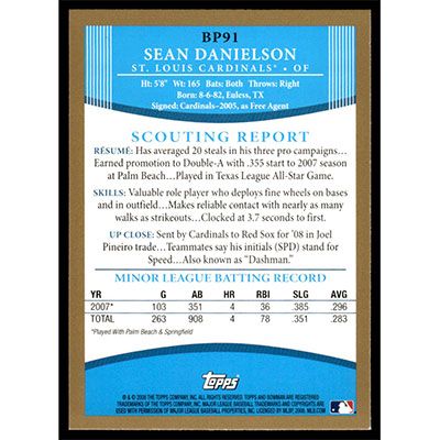 This is a 2008 Bowman Prospects Gold Sean Danielson baseball card. The card is #BP91 and pictures show condition.