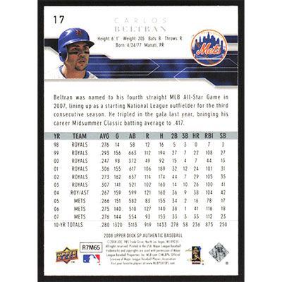 This is a 2008 SP Authentic Carlos Beltran baseball card. The card is #17 and pictures show condition.