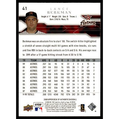 This is a 2008 SP Authentic Lance Berkman baseball card. The card is #41 and pictures show condition.