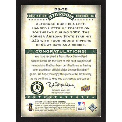 This is a 2008 SP Legendary Cuts Destination Stardom Memorabilia Travis Buck Jersey baseball card. The card is #DS-TB and pictures show condition. Team(s): Oakland Athletics