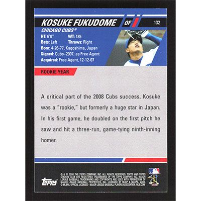 This is a 2008 Stadium Club First Day Issue Unnumbered Kosuke Fukudome baseball card. The card is #132 and pictures show condition. Team(s): Chicago Cubs Rookie Card (RC)