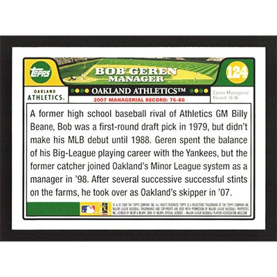 This is a 2008 Topps Bob Geren baseball card. The card is #124 and pictures show condition.