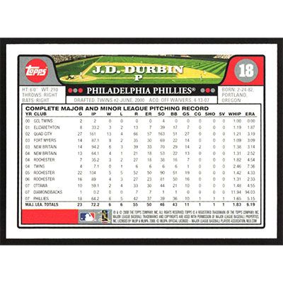 This is a 2008 Topps J.D. Durbin baseball card. The card is #18 and pictures show condition.