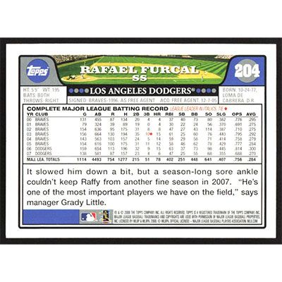 This is a 2008 Topps Rafael Furcal baseball card. The card is #204 and pictures show condition.