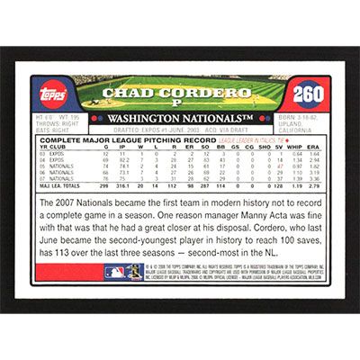 This is a 2008 Topps Chad Cordero baseball card. The card is #260 and pictures show condition.