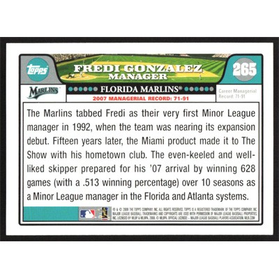 This is a 2008 Topps Fredi Gonzalez baseball card. The card is #265 and pictures show condition.