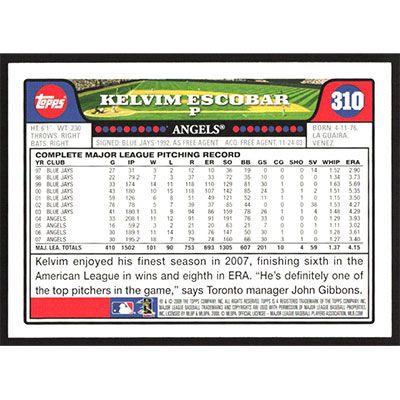 This is a 2008 Topps Kelvim Escobar baseball card. The card is #310 and pictures show condition.