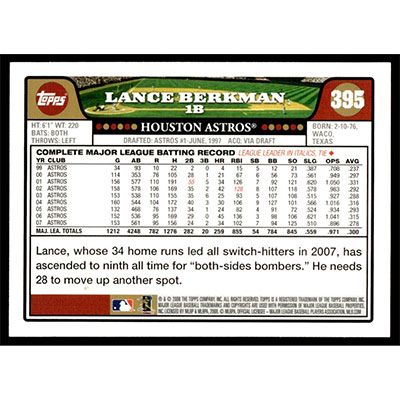 This is a 2008 Topps Lance Berkman baseball card. The card is #395 and pictures show condition.