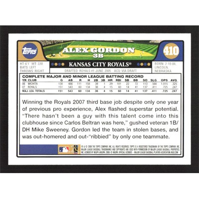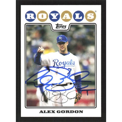 This is a 2008 Topps Alex Gordon autographed baseball card. This card has been signed, in blue, by Alex Gordon, and is guaranteed authentic by Ballcardz.com. The card is #410 and pictures show condition.