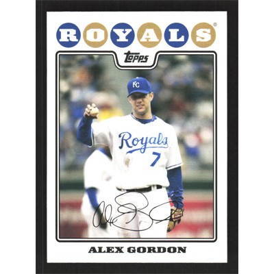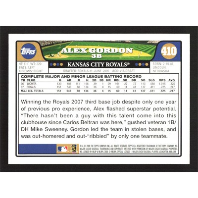 This is a 2008 Topps Alex Gordon baseball card. The card is #410 and pictures show condition.