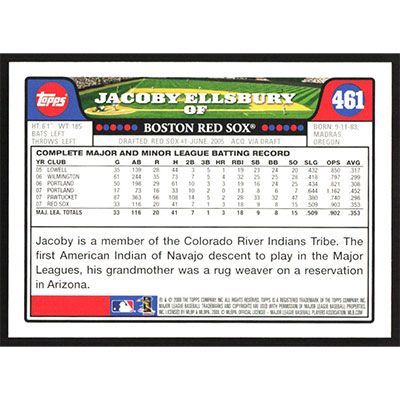 This is a 2008 Topps Jacoby Ellsbury baseball card. The card is #461 and pictures show condition.