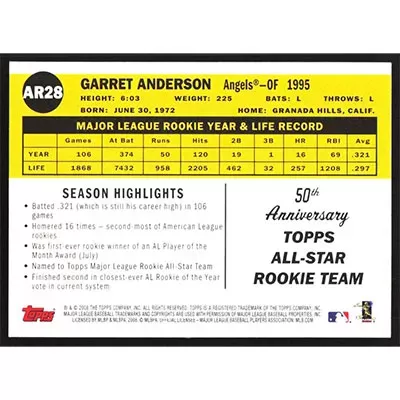 This is a 2008 Topps 50th Anniversary All-Rookie Team Garret Anderson baseball card. The card is #AR28 and pictures show condition. Team(s): California Angels