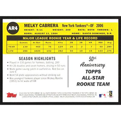 This is a 2008 Topps 50th Anniversary All Rookie Team Melky Cabrera baseball card. The card is #AR4 and pictures show condition. Team(s): New York Yankees
