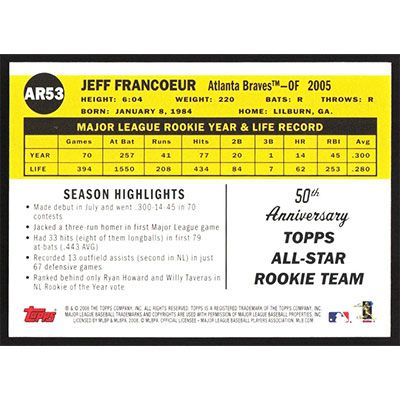 This is a 2008 Topps 50th Anniversary All-Rookie Team Jeff Francoeur baseball card. The card is #AR53 and pictures show condition. Team(s): Atlanta Braves
