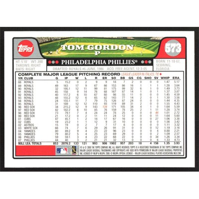 This is a 2008 Topps Tom Gordon baseball card. The card is #573 and pictures show condition.