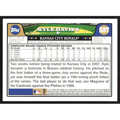 This is a 2008 Topps Kyle Davies baseball card. The card is #597 and pictures show condition.