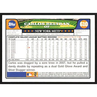 This is a 2008 Topps Carlos Beltran baseball card. The card is #610 and pictures show condition.