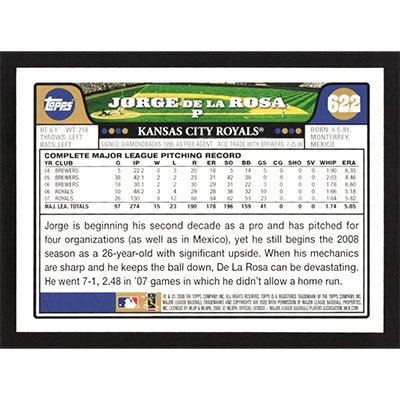 This is a 2008 Topps Jorge De La Rosa baseball card. The card is #622 and pictures show condition.