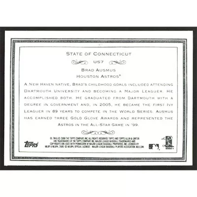 This is a 2008 Topps Allen & Ginter United States Brad Ausmus baseball card. The card is #US7 and pictures show condition.