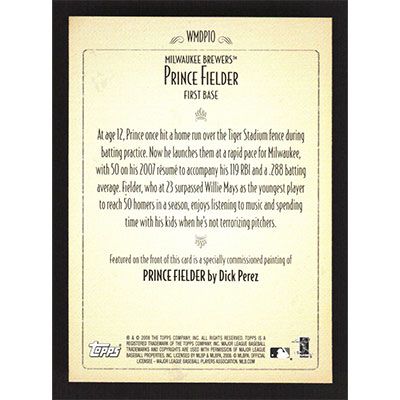This is a 2008 Topps Dick Perez Prince Fielder baseball card. The card is #WMDP10 and pictures show condition.