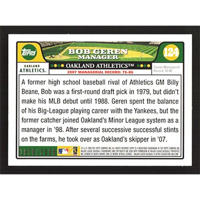 This is a 2008 Topps Gold Bob Geren baseball card. The card is #124 and pictures show condition. This card is limited; #'d 1970/2008. Team(s): Oakland Athletics