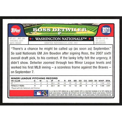 This is a 2008 Topps K-Mart Ross Detwiler baseball card. The card is #RV11 and pictures show condition. Team(s): Washington Nationals Rookie Card (RC)