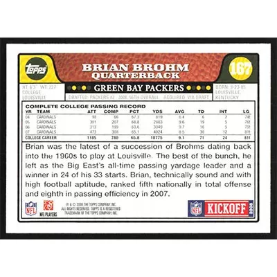 This is a 2008 Topps Kickoff Brian Brohm football card. The card is #167 and pictures show condition.
