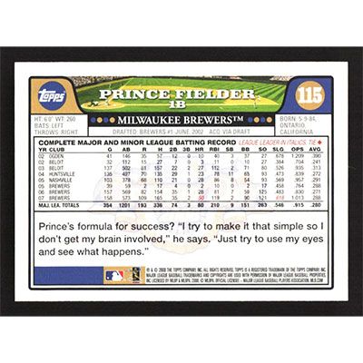 This is a 2008 Topps Opening Day Prince Fielder baseball card. The card is #115 and pictures show condition.