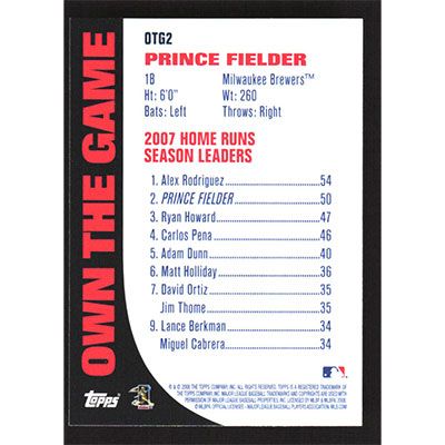 This is a 2008 Topps Own the Game Prince Fielder baseball card. The card is #OTG2 and pictures show condition.