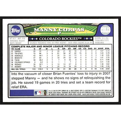 This is a 2008 Topps Team Set Manny Corpas autographed baseball card. This card has been signed, in blue, by Manny Corpas, and is guaranteed authentic by Ballcardz.com. The card is #COL13 and pictures show condition.