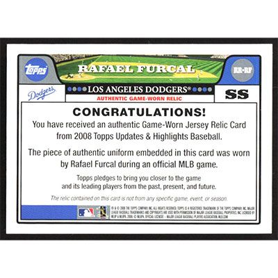 This is a 2008 Topps Update Retail Relics Rafael Furcal Jersey baseball card. The card is #RR-RF and pictures show condition. Team(s): Los Angeles Dodgers