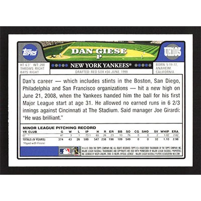 This is a 2008 Topps Update Dan Giese baseball card. The card is #UH105 and pictures show condition.