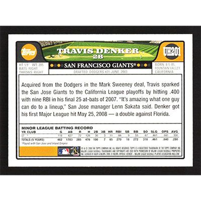 This is a 2008 Topps Update Travis Denker baseball card. The card is #UH201 and pictures show condition. Team(s): San Francisco Giants Rookie Card (RC)