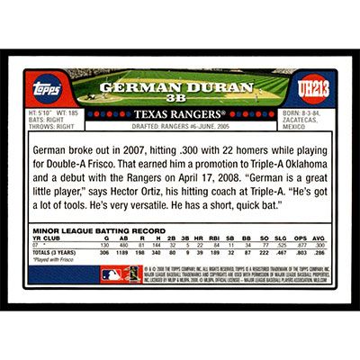 This is a 2008 Topps Update German Duran baseball card. The card is #UH213 and pictures show condition.