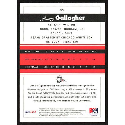 This is a 2008 TRISTAR PROjections Jimmy Gallagher baseball card. The card is #85 and pictures show condition.