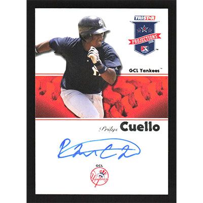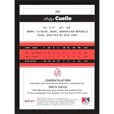 This is a 2008 TriStar PROjections Autographs Prilys Cuello autographed baseball card. This card has been signed, in blue, by Prilys Cuello, and is certified authentic by TRISTAR. The card is #325 and pictures show condition.